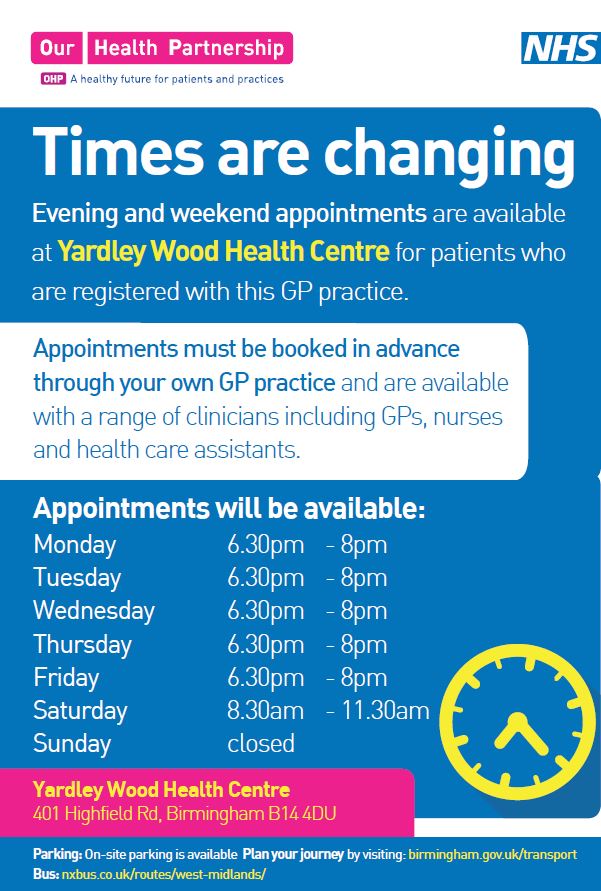 Patients may pre-book appointments with the doctor between 0920 1120 and 1630 1820. Web Yardley Wood Health Centre. Web Yardley Wood Health Centre is located in 401 Highfield Road Birmingham B14 4DU.